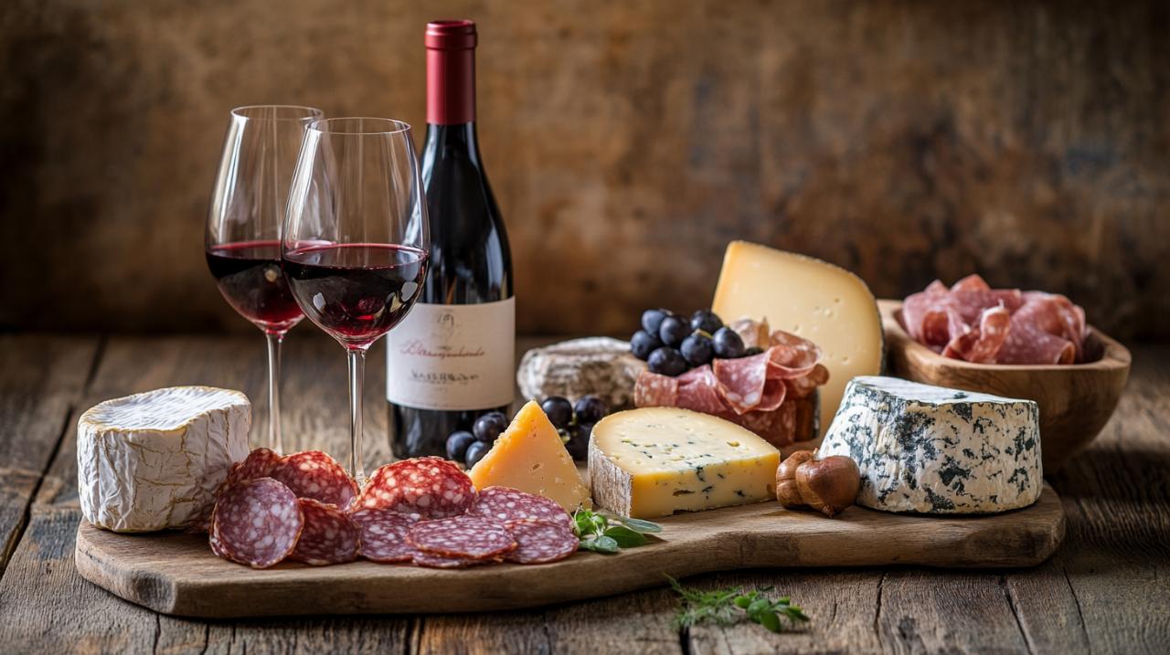 Le saucisson sec figure parmi les compagnons privilégiés du beaujolais nouveau. Sa texture ferme et ses arômes épicés créent un contraste harmonieux avec la légèreté du vin. La rosette, variante lyonnaise du saucisson, apporte également une dimension gourmande particulièrement appréciée lors des dégustations festives. Le pâté en croûte, spécialité emblématique de la région lyonnaise, constitue un accord remarquable avec le vin primeur. Sa structure feuilletée et sa garniture savoureuse s’harmonisent avec les notes fruitées du gamay. Les terrines et les pâtés de campagne offrent également des possibilités d’accords intéressantes, leur texture onctueuse complétant la rondeur du vin. Pour composer un plateau réussi, il suffit d’associer ces charcuteries à du pain de campagne frais, quelques cornichons et des noix pour apporter du croquant.